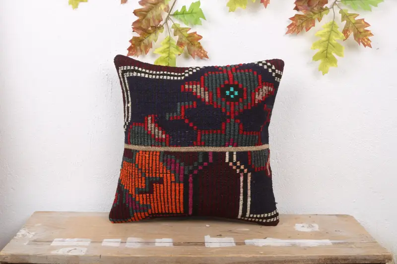 Embroidered Orange & Brown Patchwork Throw Pillow, Vintage Cushion