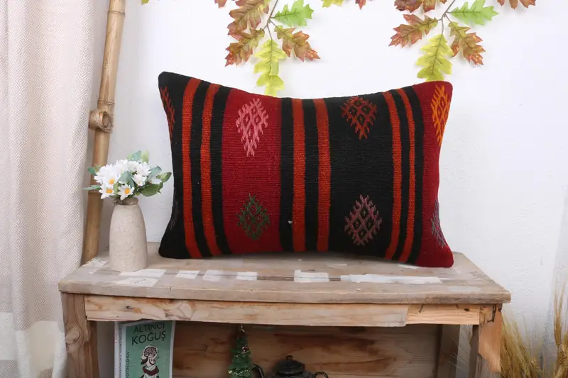 Red & Brown Striped Throw Pillow, Handmade Embroidered Cushion