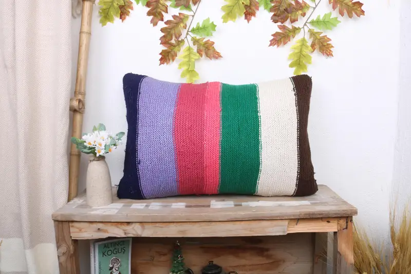 Pink Striped Linen Throw Pillow, 16x24 Embroidered Cushion