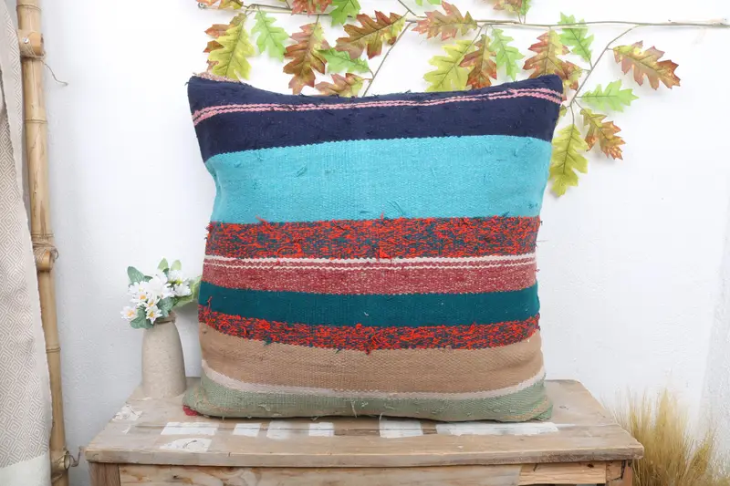 Green, bronze striped throw pillow, vintage embroidered linen cushion