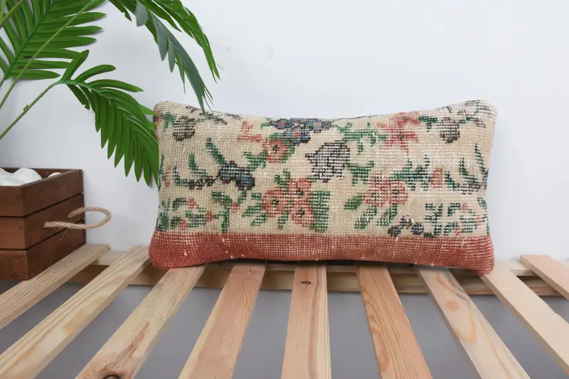 Red & Bronze Floral Linen Pillow, 10x20 Embroidered Throw Pillow