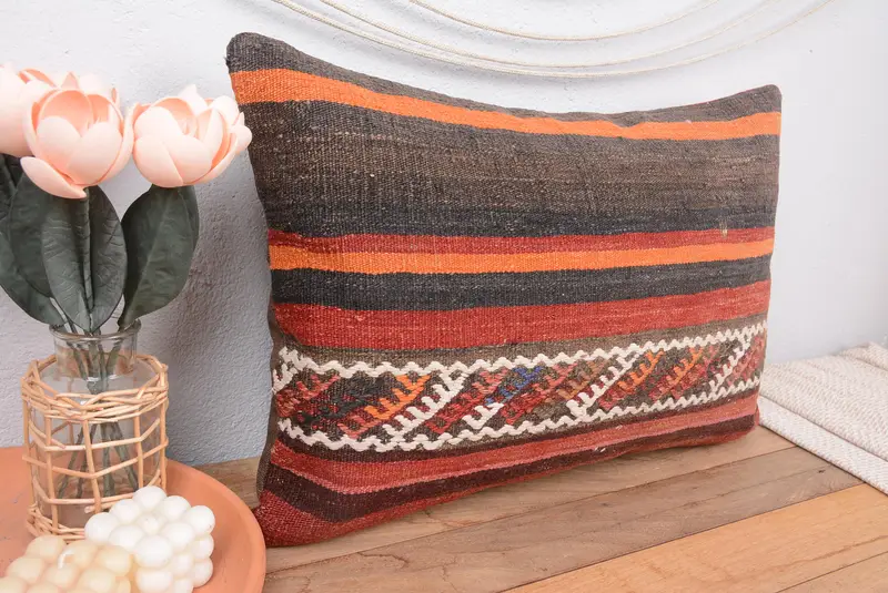 Embroidered Brown & Red Striped Pillow, Handmade Vintage Throw Pillow
