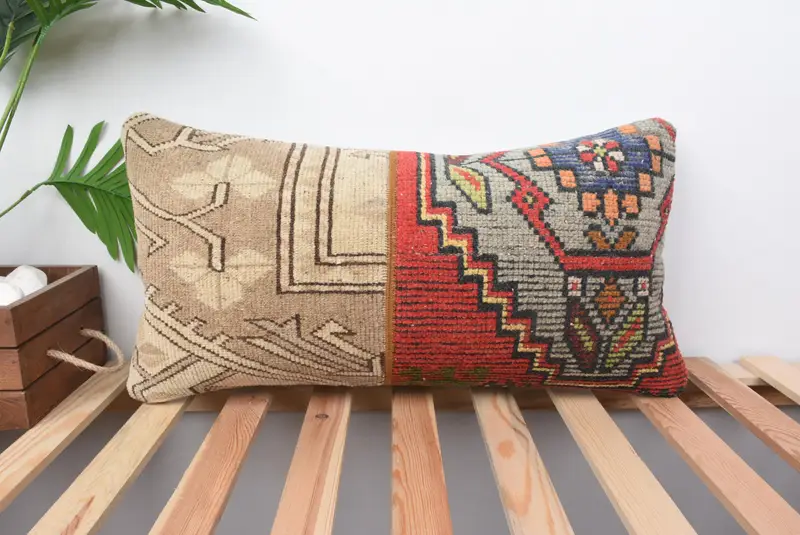 Red Patchwork Throw Pillow, 12x24 Handmade Embroidered Cushion