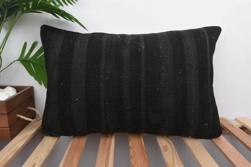 Handmade Black & Gray Striped Throw Pillow, 16x24 Embroidered Cushion