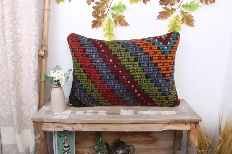 Red & Green Geometric Throw Pillow, Handmade 16x24 Linen Cushion