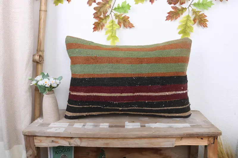 Brown & Red Striped Throw Pillow, Vintage Embroidered Cushion