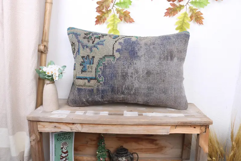Blue & Beige Embroidered Throw Pillow, Handmade Linen Pillow