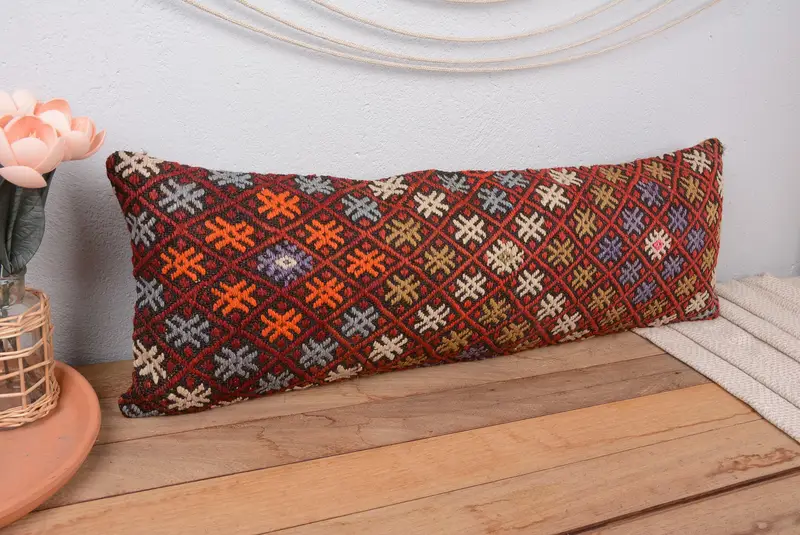 Red Southwestern Embroidered Pillow, 12x36 Handmade Throw Pillow