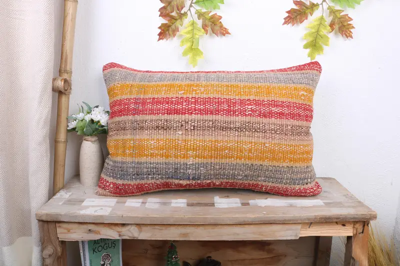 Embroidered Orange & Red Striped Pillow, Vintage Handmade Throw Pillow