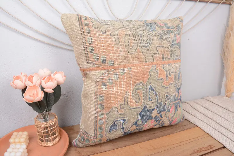 Embroidered Orange Patchwork Throw Pillow, 24x24 Vintage Cushion