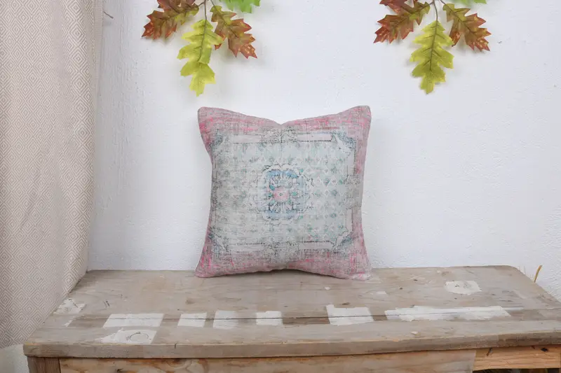 Embroidered Pink & Green Throw Pillow, Vintage Square Pillow