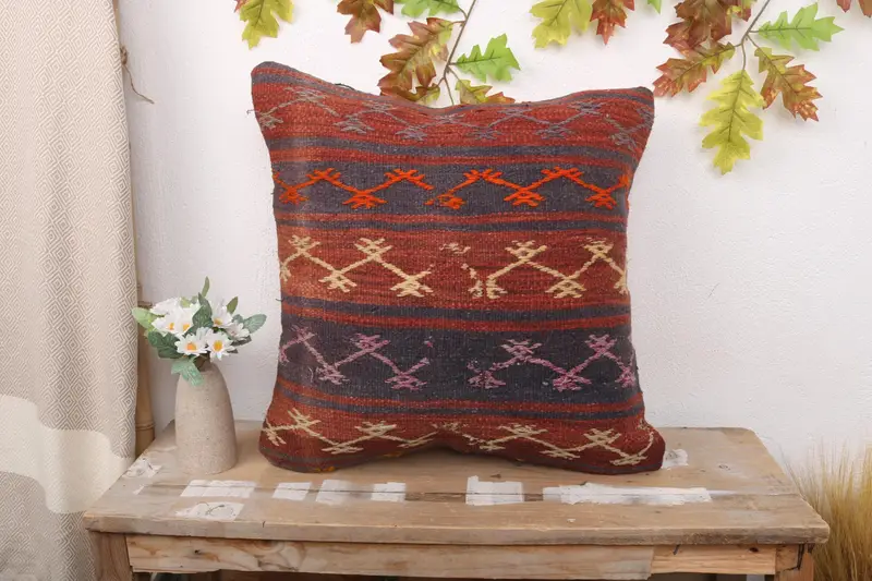 Red Kilim Throw Pillow, 20x20 Embroidered Cushion with Geometric Pattern