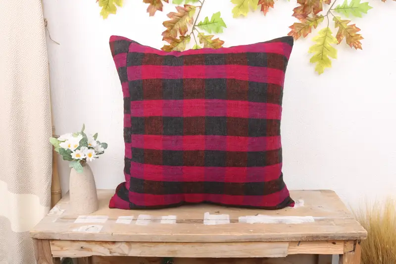 Purple & Brown Striped Linen Throw Pillow, Embroidered Vintage Cushion
