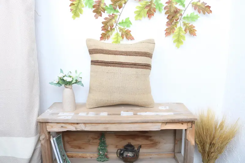 Beige & Brown Striped Throw Pillow, Vintage Embroidered Pillow