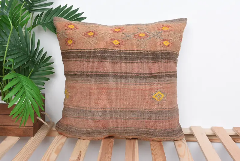 Brown & Yellow Striped Linen Throw Pillow, 20x20 Embroidered Cushion
