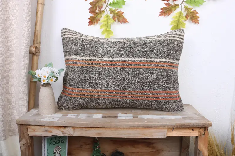 Embroidered Brown & White Striped Pillow, Vintage Handmade Throw Pillow