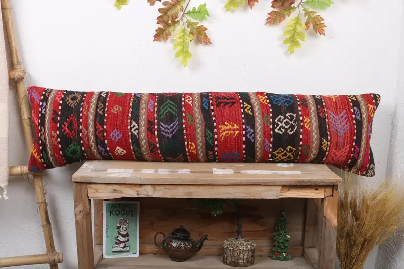 Red & Brown Embroidered Throw Pillow, 12x48 Handmade Linen Cushion