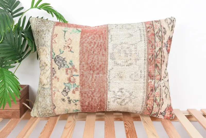 Red & Beige Patchwork Throw Pillow, 20x28 Handmade Linen Pillow