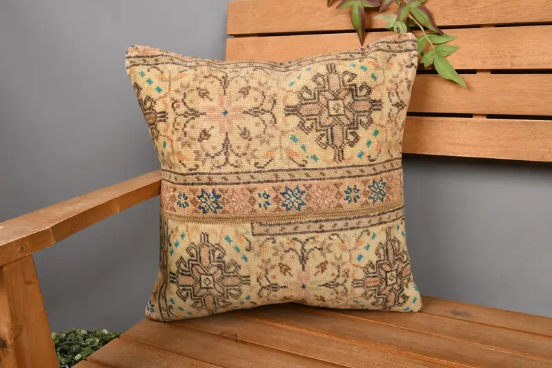 Beige & Brown Embroidered Throw Pillow, Handmade Patchwork Pillow