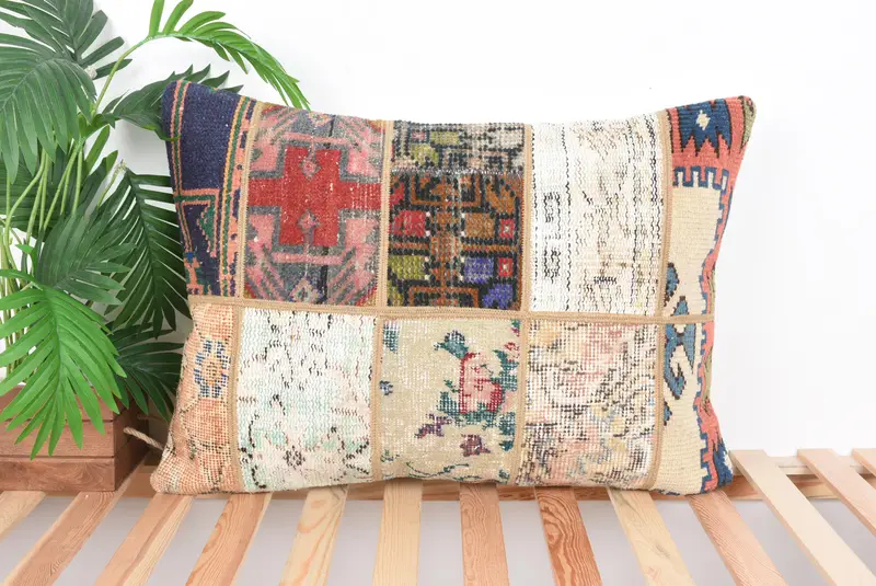 Red & Purple Patchwork Throw Pillow, 20x28 Embroidered Cushion
