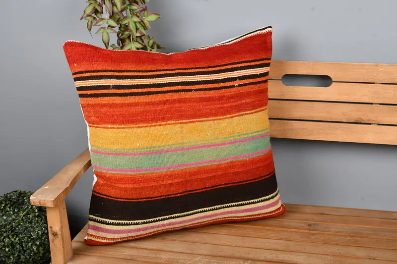 Red & Yellow Striped Throw Pillow, Embroidered Decorative Cushion
