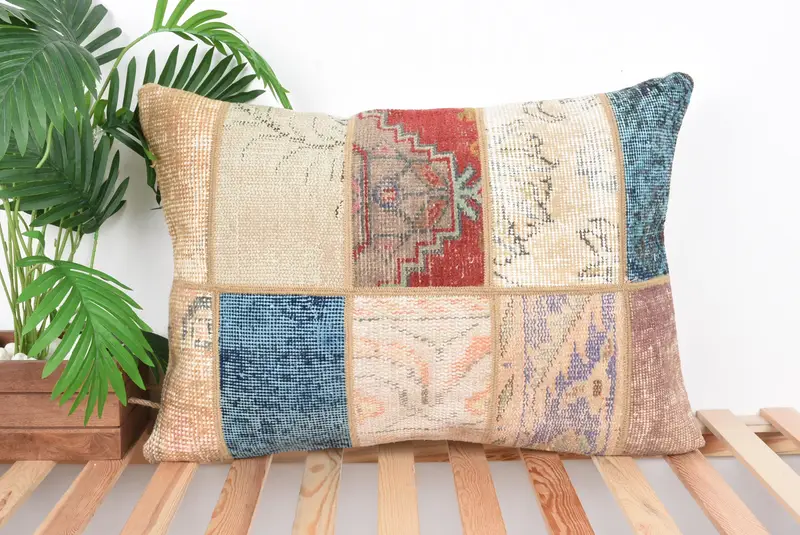 Beige & Red Patchwork Throw Pillow, 20x28 Embroidered Cushion