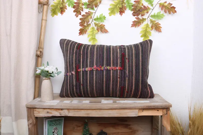 Red Striped Throw Pillow, Vintage Embroidered Cushion