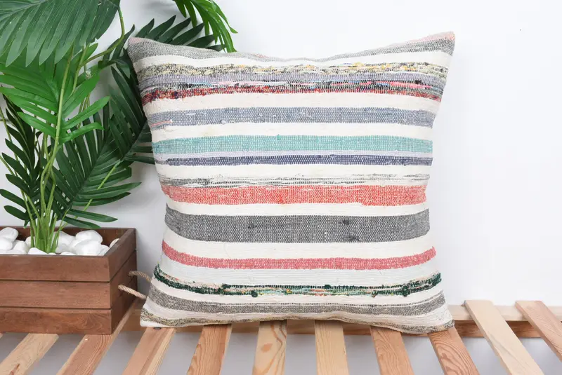 Handmade Green & White Striped Throw Pillow, Vintage Embroidered Cushion