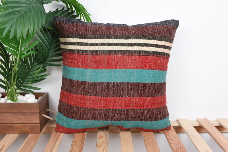Red & Green Striped Throw Pillow, Handmade Embroidered Cushion
