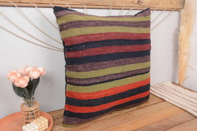 Green & Red Striped Throw Pillow, Handmade Vintage Kilim Pillow
