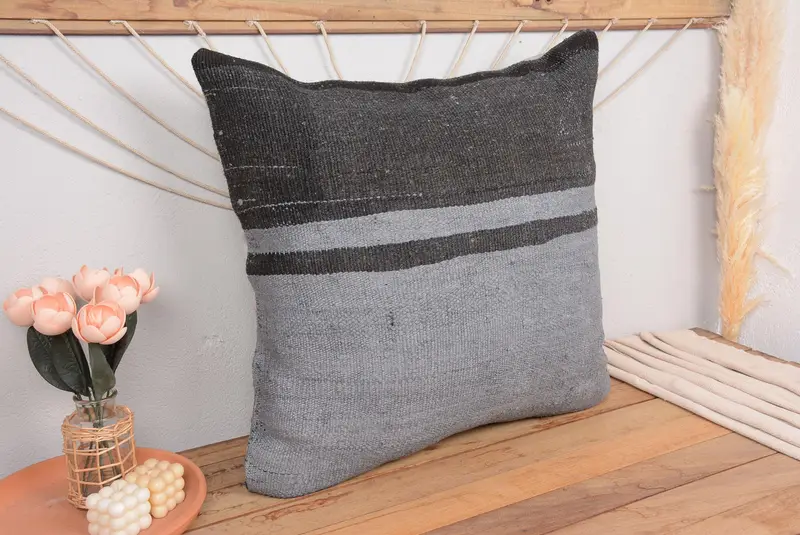 Embroidered Blue & Brown Striped Throw Pillow, Vintage Handmade Cushion