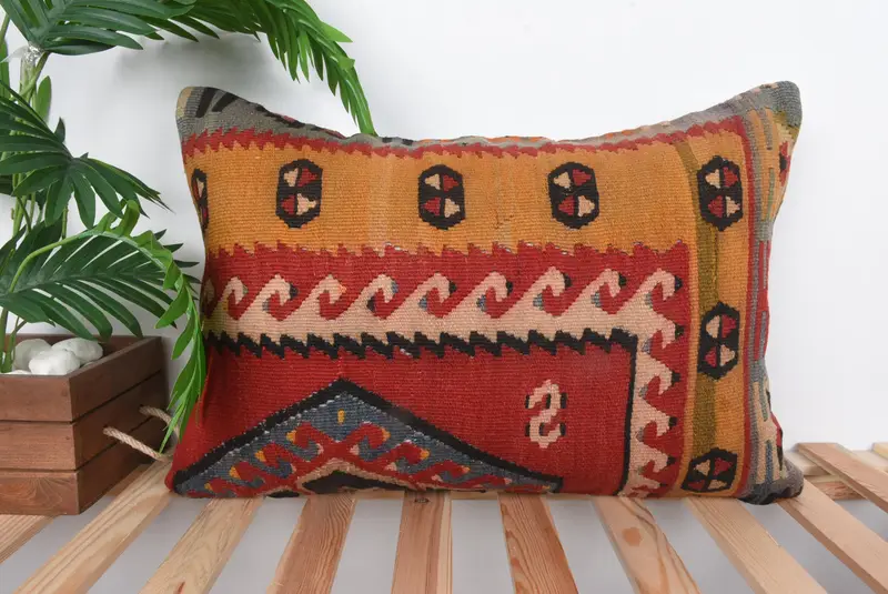 Red & Yellow Geometric Throw Pillow, Vintage Embroidered Cushion