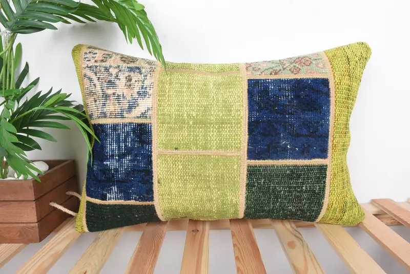 Green & Purple Patchwork Throw Pillow, Handmade Vintage Cushion