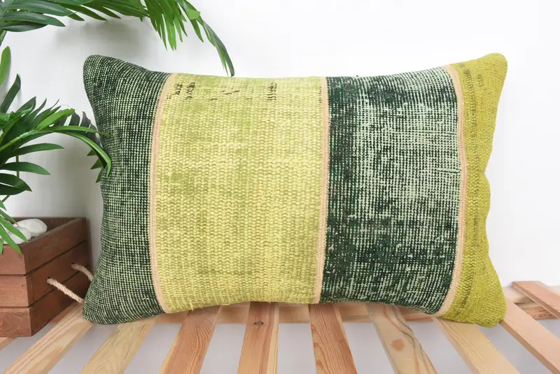 Handmade Green Patchwork Throw Pillow, 16x24 Embroidered Cushion