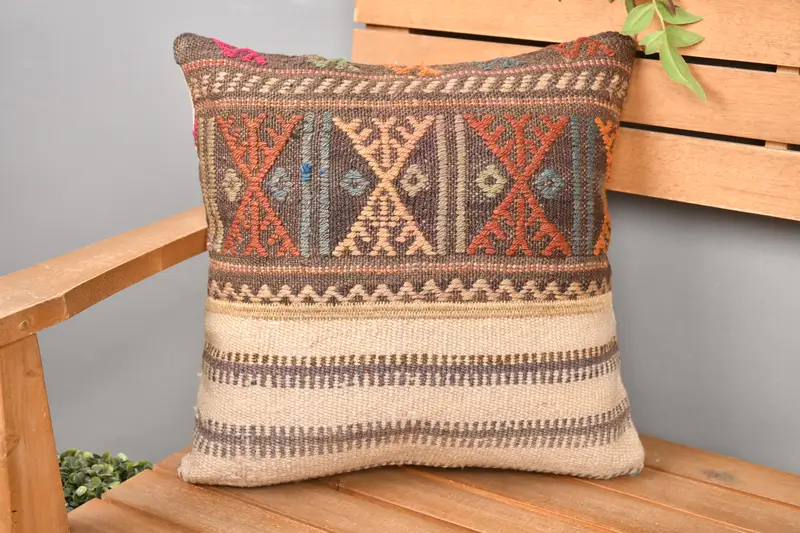 Embroidered Orange & Beige Patchwork Throw Pillow, Handmade Vintage Pillow