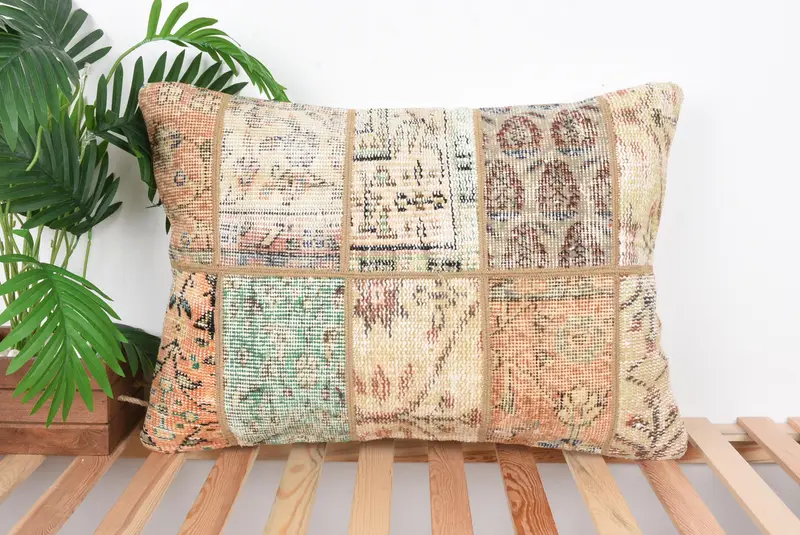 Green & Beige Patchwork Throw Pillow, 20x28 Handmade Cushion