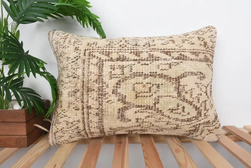 Beige & Brown Floral Embroidered Pillow, 16x24 Handmade Throw Pillow
