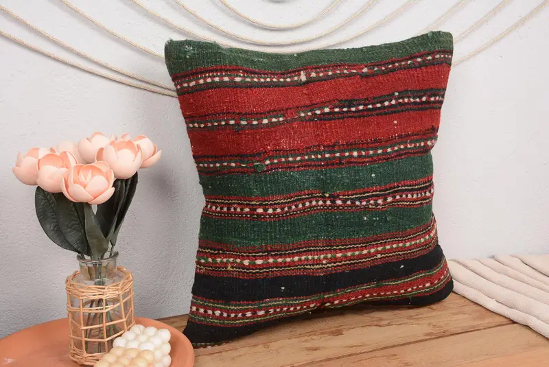 Red & Brown Striped Throw Pillow, Handmade Embroidered Cushion