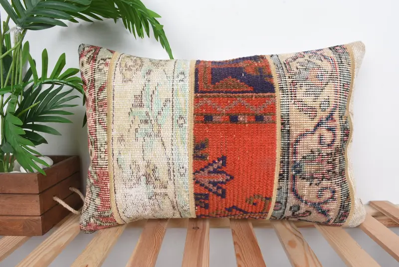 Beige & Red Embroidered Pillow, Handmade Patchwork Throw Pillow