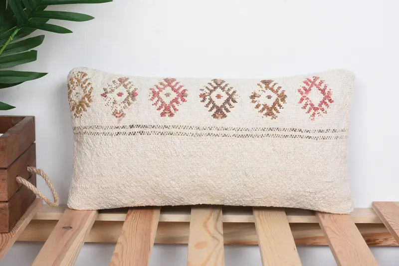 Handmade Linen Throw Pillow, Embroidered Geometric Rectangle Pillow