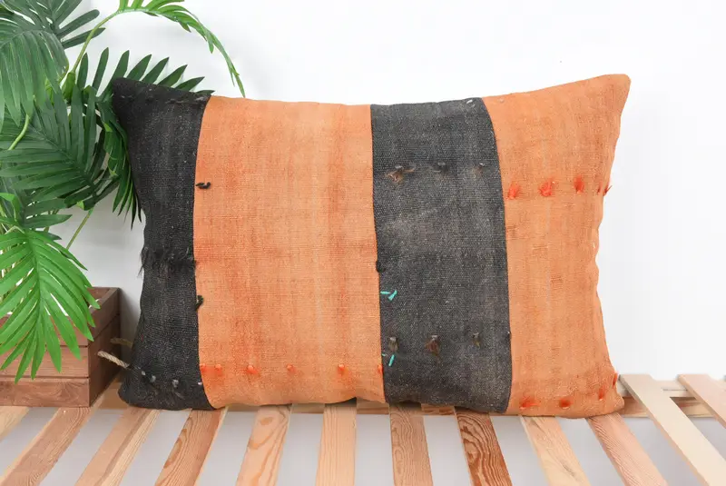 Orange & Brown Striped Throw Pillow, Handmade Embroidered Cushion