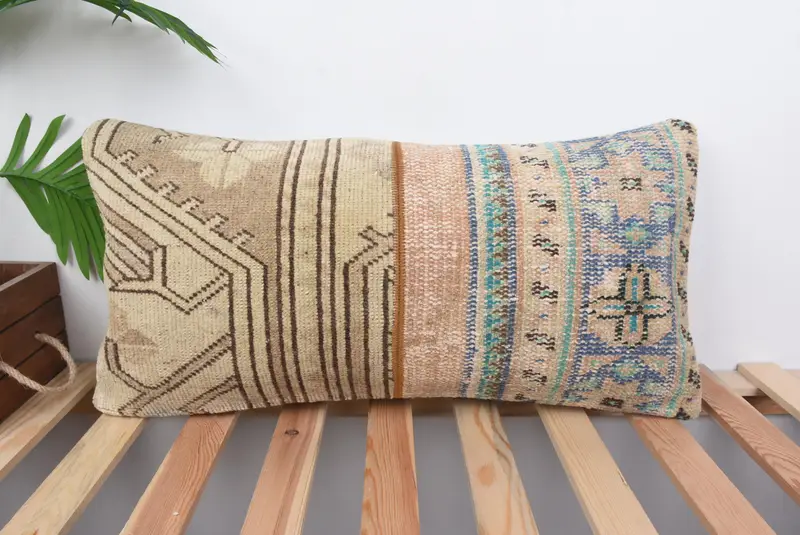 Blue & Beige Patchwork Throw Pillow, Handmade Rectangle Cushion
