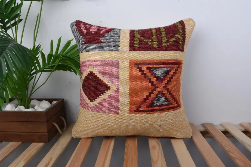 Brown & Red Geometric Throw Pillow, Vintage Embroidered Cushion