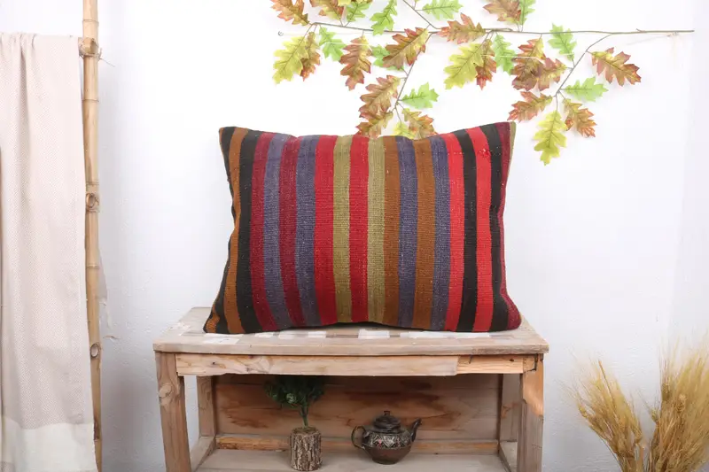 Embroidered Green & Red Striped Pillow, Handmade 20x28 Throw Pillow