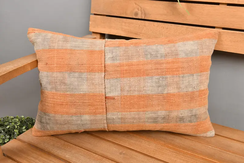 Orange & Beige Patchwork Throw Pillow, 12x20 Handmade Linen Pillow