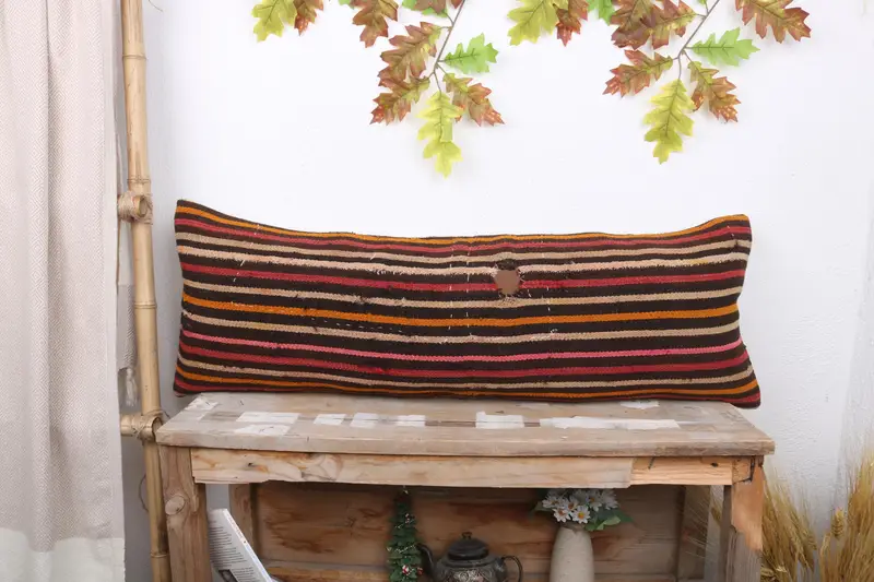 Handmade Embroidered Pillow, 12x36 Pink & Brown Striped Throw Pillow