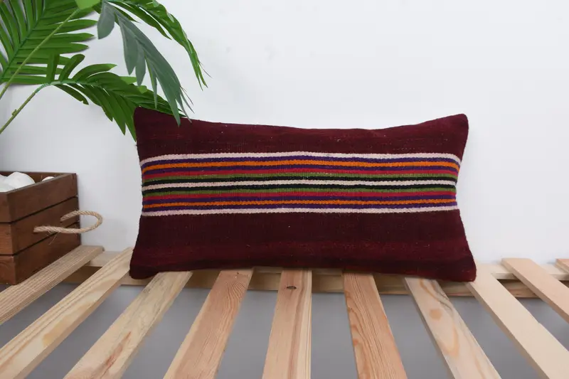 Red & Brown Striped Throw Pillow, Embroidered Vintage Cushion
