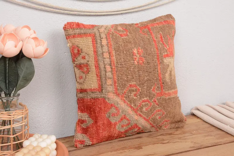 Brown & Red Embroidered Throw Pillow, 14x14 Handmade Cushion