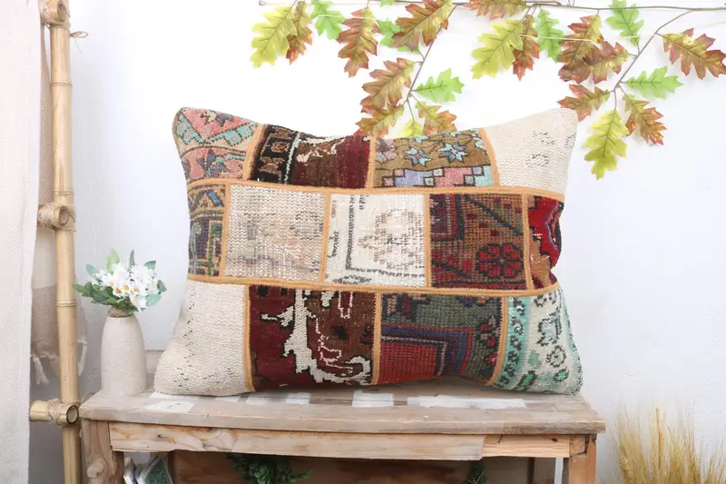 Beige & Green Patchwork Kilim Pillow, 20x28 Vintage Throw Pillow