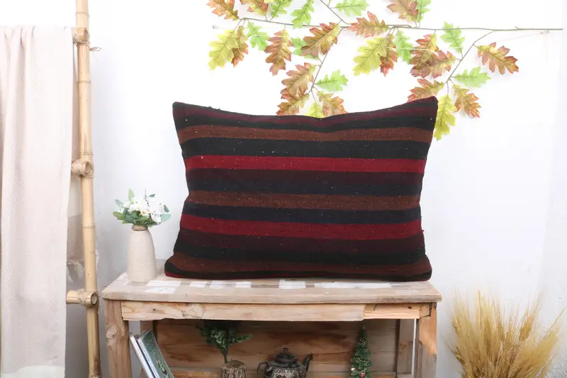 Red & Brown Striped Throw Pillow, Handmade Embroidered Cushion